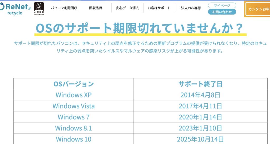 Windows10でさえも2025年10月14日で無料のサポート期限が切れるので、それ以降はウイルス感染のリスクが高まります。