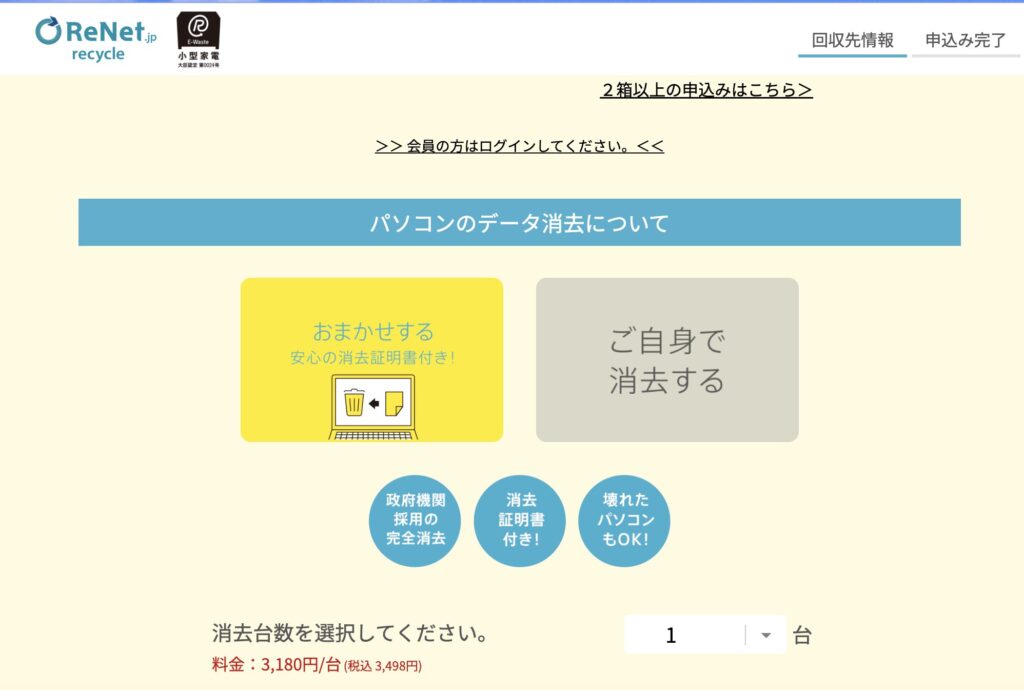 不要なパソコンの回収は無料ですが、データを消去してもらうには1台あたり3,180円(税込3,498円)の料金が発生することは覚えておきましょう。
